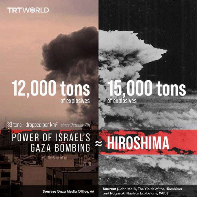 Ami 2003 óta Gázára hullott, azt becslések szerint több mint 90 000 tonna bomba tette ki. Ezeknek a bombáknak a sugárzása meghaladja Hirosima és Nagaszaki sugárzását. És a mai hatások talán hatszor vagy hétszer rosszabbak, mint azok a bombázások – állítja.